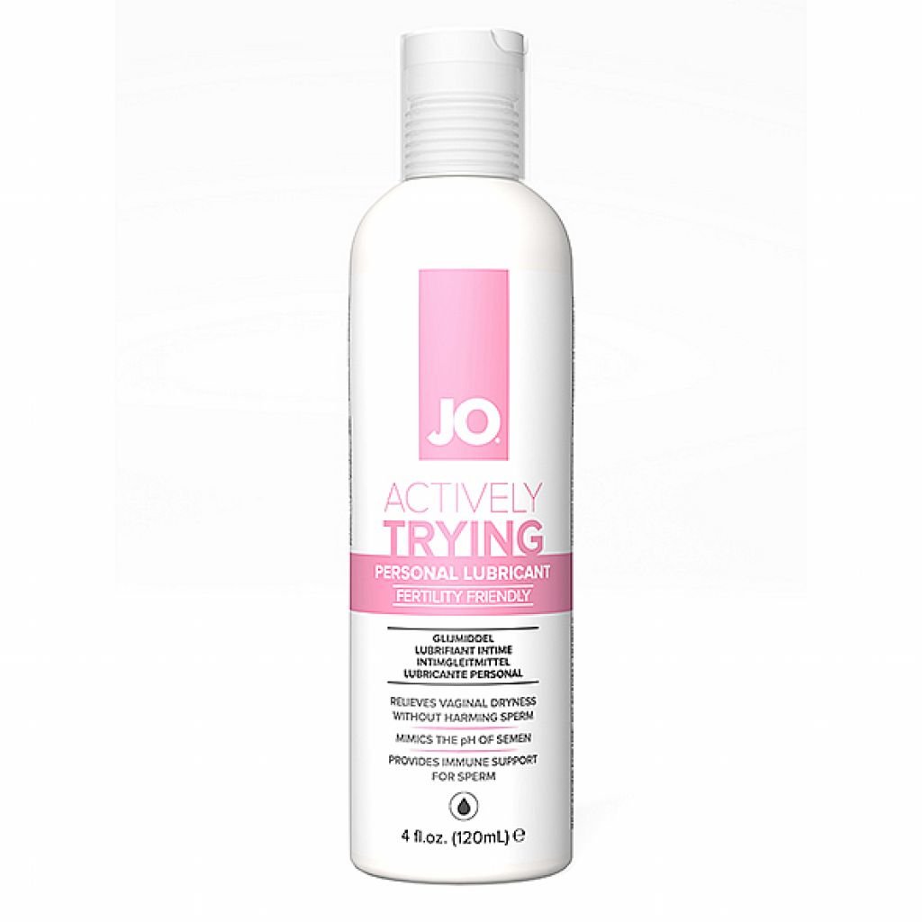 JO ACTIVELY TRYING lubricant creates a healthy environment for sperm with optimized pH levels that mimic the alkaline balance of sperm and fertile cervical mucus. Its water-based and silk-like smoothness allows it to mix easily with his and her fluids without interfering with competing elements, not only encouraging sperm to complete their journey to conception, but also enhancing the overall experience with a natural and sensual feeling. – Mimics the pH of sperm and cervical mucus. – Reduces vaginal dryness without harming sperm. – Promotes conception. – Allows sperm to freely swim to their destination. 120 ml